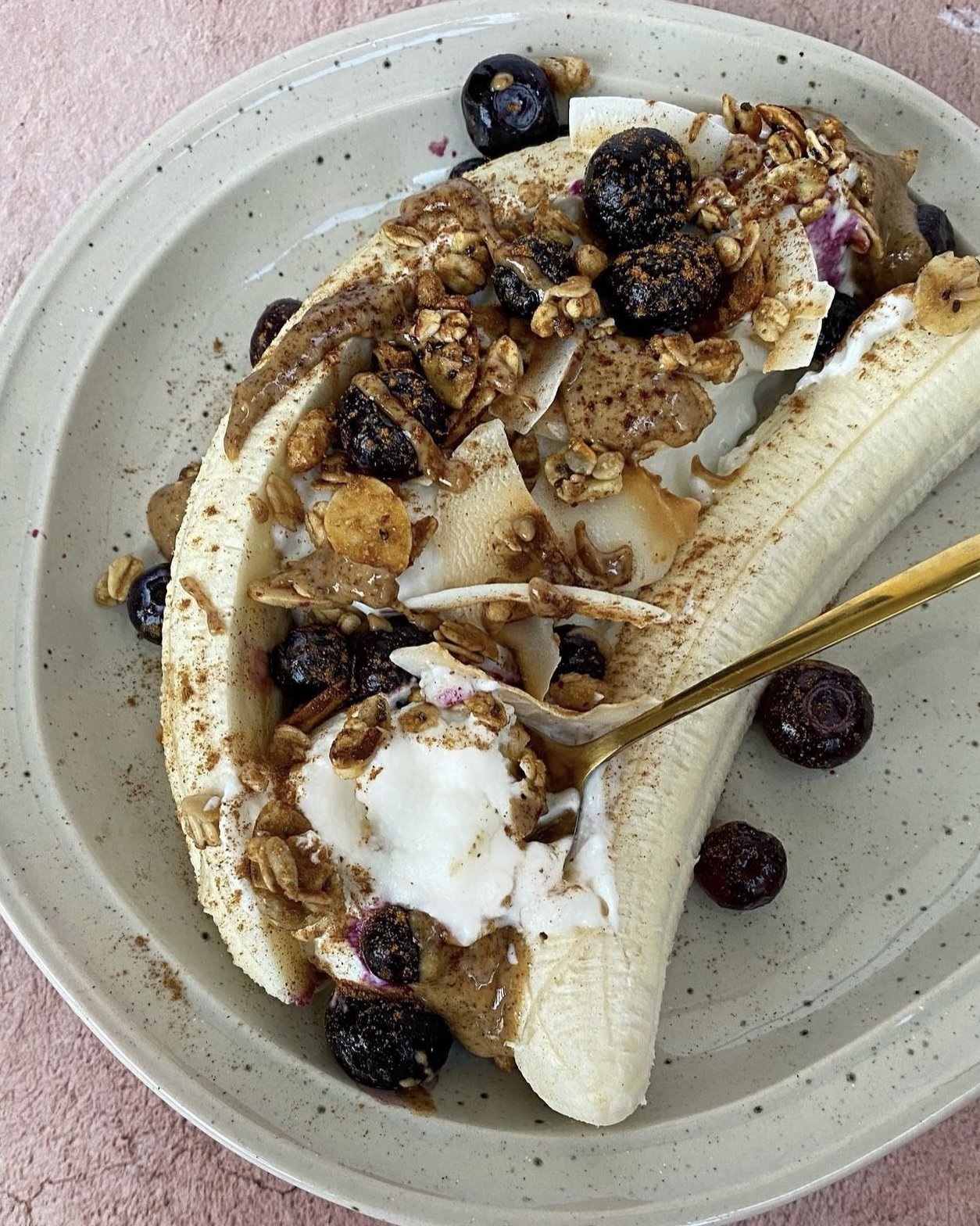 Place the coconut yogurt between the banana halves.